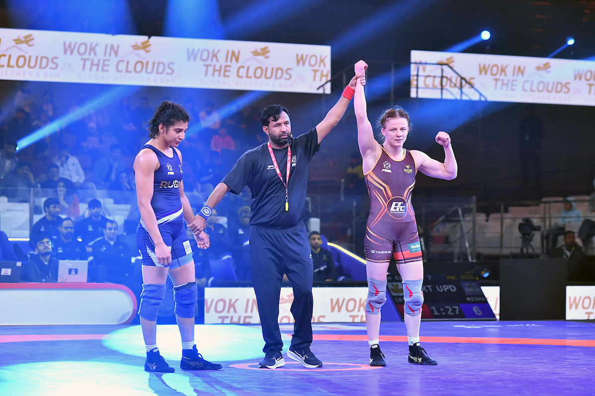 57 किग्रा महिला वर्ग में यूपी डोमिनेटर्स की ओर से तपस्या गहलावत ने शानदार प्रदर्शन करते हुए टीम को मुकाबले में वापस ला दिया। पावर मिनट में नियंत्रण बनाते हुए उन्होंने दो निर्णायक टेकडाउन लगाए और 10–3 की जीत दर्ज की।